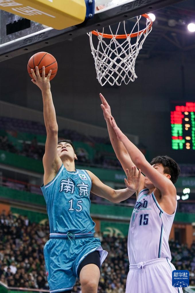 3月14日,南京头排苏酒队球员刘东(左)在青岛国信水产队球员杨瀚森的防守下上篮。新华社记者 李博 摄