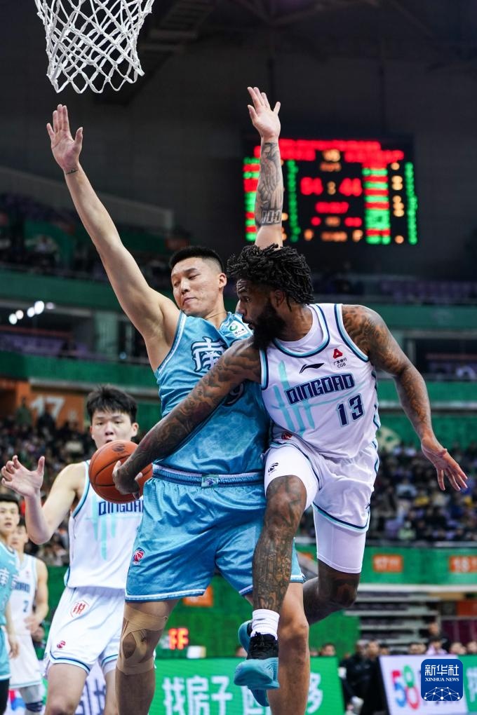3月14日,青岛国信水产队球员鲍威尔(前左)在比赛中上篮。新华社记者 李博 摄