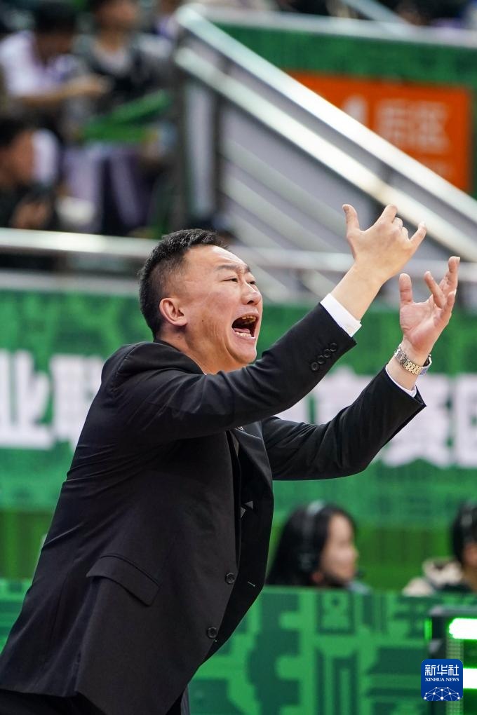 3月14日,青岛国信水产队主教练刘维伟在场边指挥。新华社记者 李博 摄