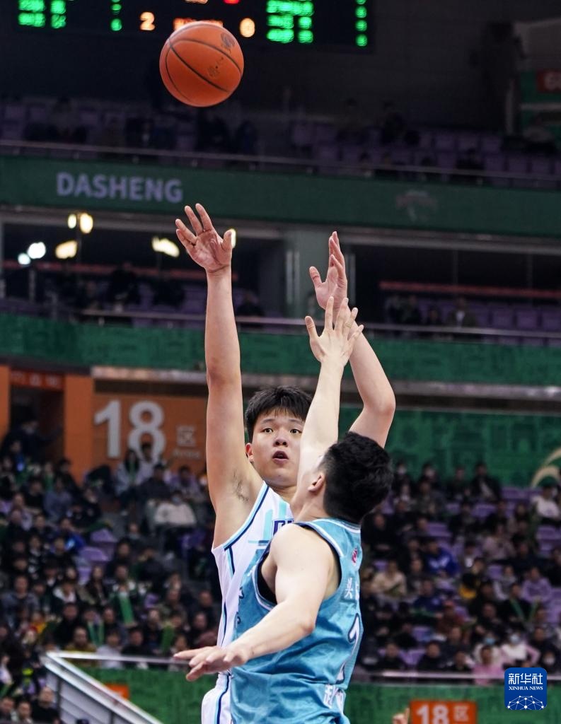 3月14日,青岛国信水产队球员杨瀚森(右)在南京头排苏酒队球员曾繁日的防守下投篮。新华社记者 李博 摄