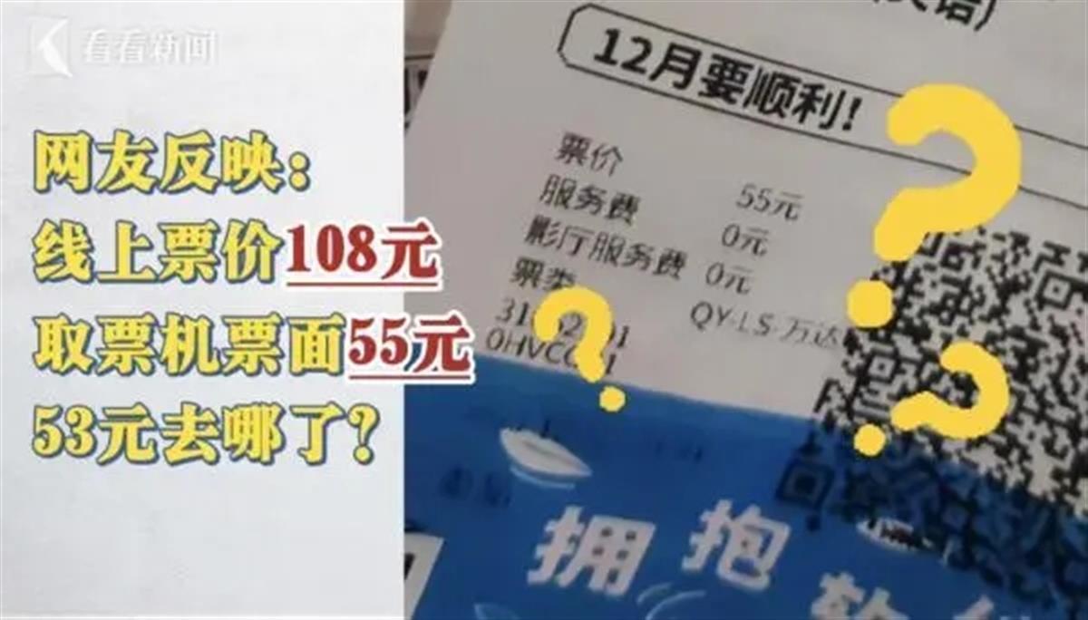 最近,有上海网友称,线上购票108元一张的电影票,到影院取票机取出来,票面仅显示为55元,让他不禁疑惑,中间消失的53元去哪儿了?