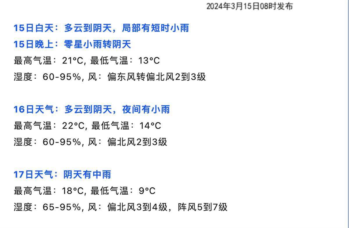 昨天武汉市晴天到多云,最低气温10.2℃,最高气温21.2℃。今天早晨武汉市多云,最低气温10.1℃。预计15日至18日受高空波动东移影响,武汉市有降水发生,17日至18日受冷空气影响,武汉市北风增强,气温下降。武汉市气象局提醒市民,春季天气变化频繁,气温起伏大,大家要随时关注天气变化,合理安排周末出行。