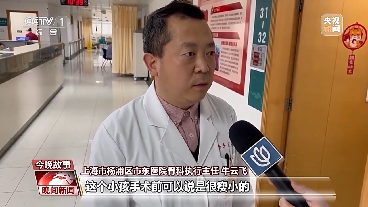上海市杨浦区市东医院骨科执行主任 牛云飞:这个小孩手术前可以说是很瘦小的,身高1米22,术后现在我们测量身高达到了1米43。