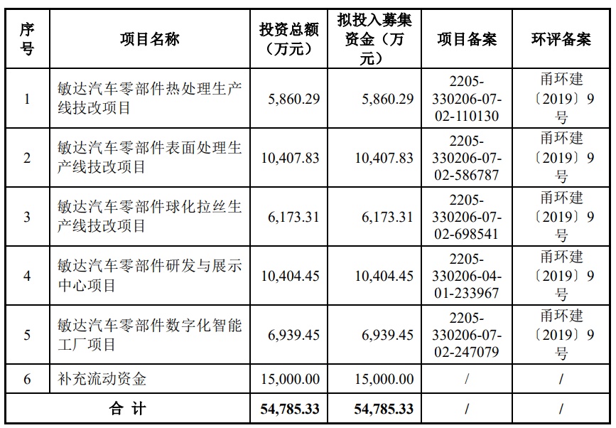 敏达股份原拟在上交所主板公开发行的股票数量不超过14,134.2116万股,不低于本次发行后总股本的10%,不涉及公司股东公开发售股份。公司原拟募集资金54,785.33万元,用于敏达汽车零部件热处理生产线技改项目、敏达汽车零部件表面处理生产线技改项目、敏达汽车零部件球化拉丝生产线技改项目、敏达汽车零部件研发与展示中心项目、敏达汽车零部件数字化智能工厂项目、补充流动资金。