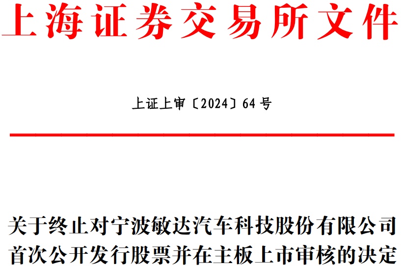 中国经济网北京3月16日讯 上交所网站昨日披露关于终止对宁波敏达汽车科技股份有限公司(简称“敏达股份”)首次公开发行股票并在主板上市审核的决定。