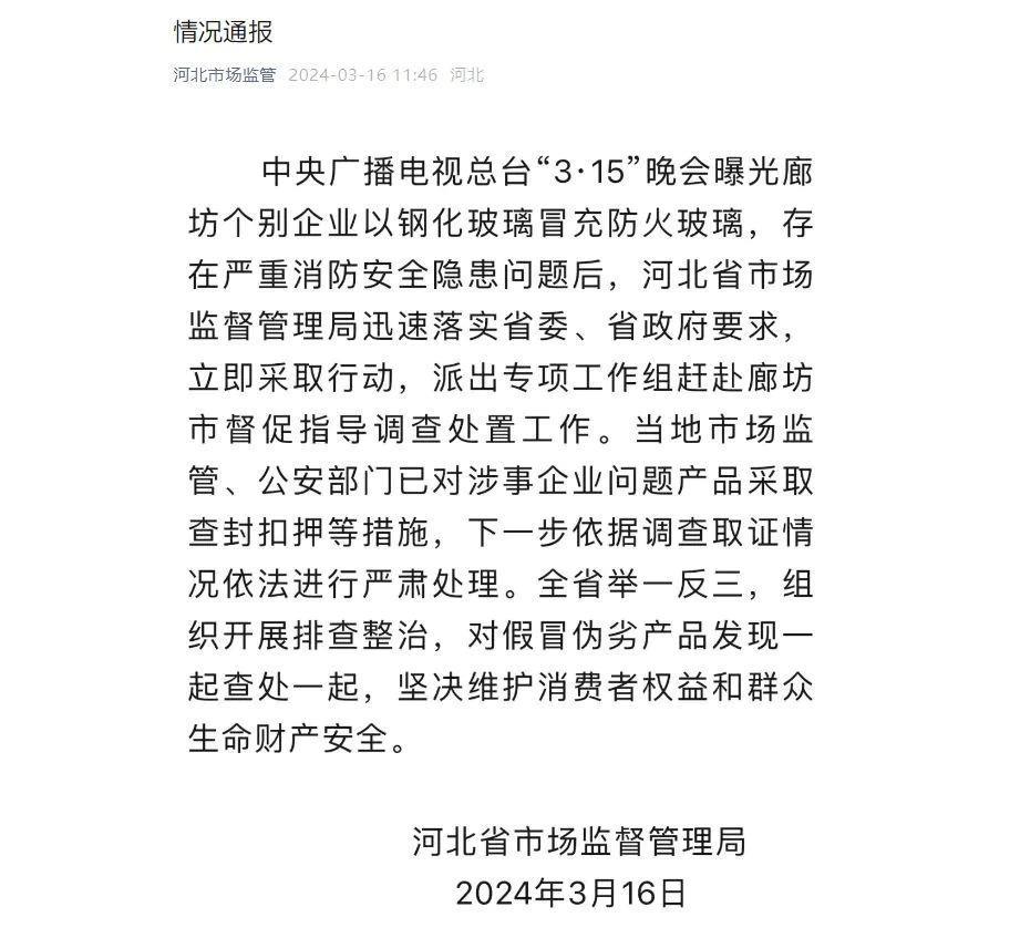 2024年总台“3·15”晚会曝光了河北廊坊个别企业以钢化玻璃冒充防火玻璃,存在严重的消防安全隐患问题。随着黑幕被一一揭开,不法商贩的恶劣行为令人震惊。