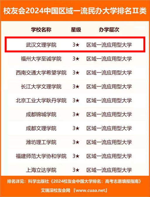 近日,《2024校友会中国大学排名:高考志愿填报指南》发布,武汉文理学院位列校友会2024中国区域一流民办大学排名Ⅱ类榜首,办学层次为中国区域一流应用型大学,是中国区域综合实力较强、办学水平一流的民办高校。