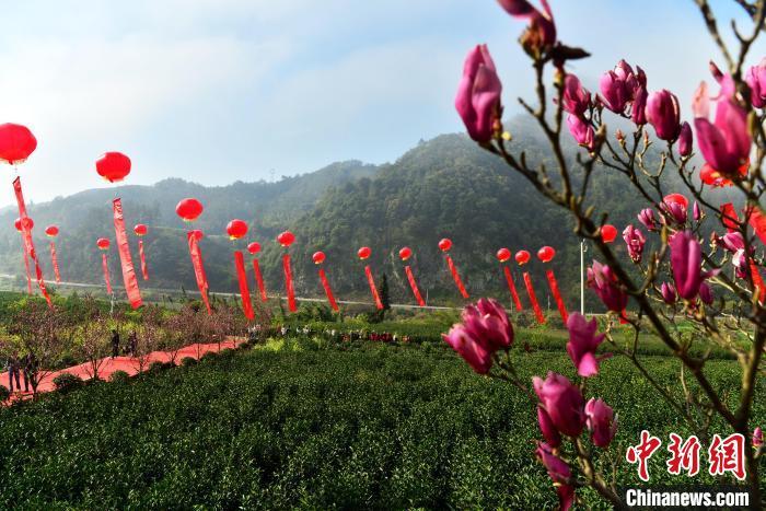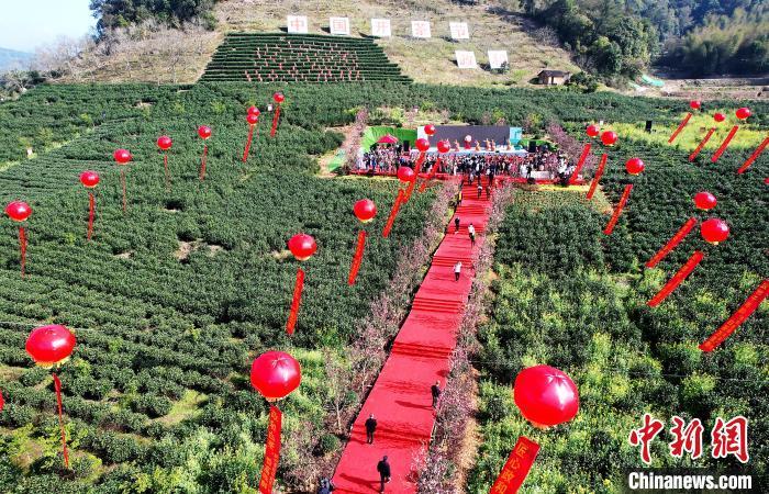 3月20日,第六届政和白茶开茶节在福建省政和县西津畲族村红岩岗生态茶园举行。(无人机照片) 中新网记者 张斌 摄