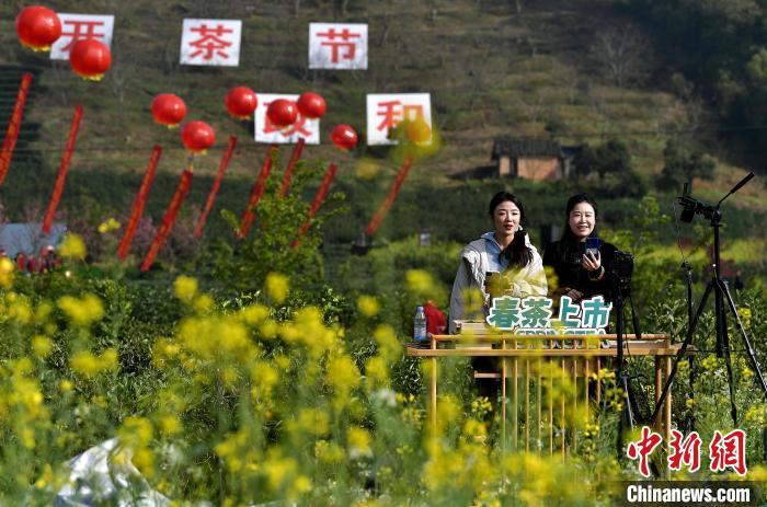 图为3月20日,开茶节上主播在茶园直播预售春茶。 中新网记者 张斌 摄