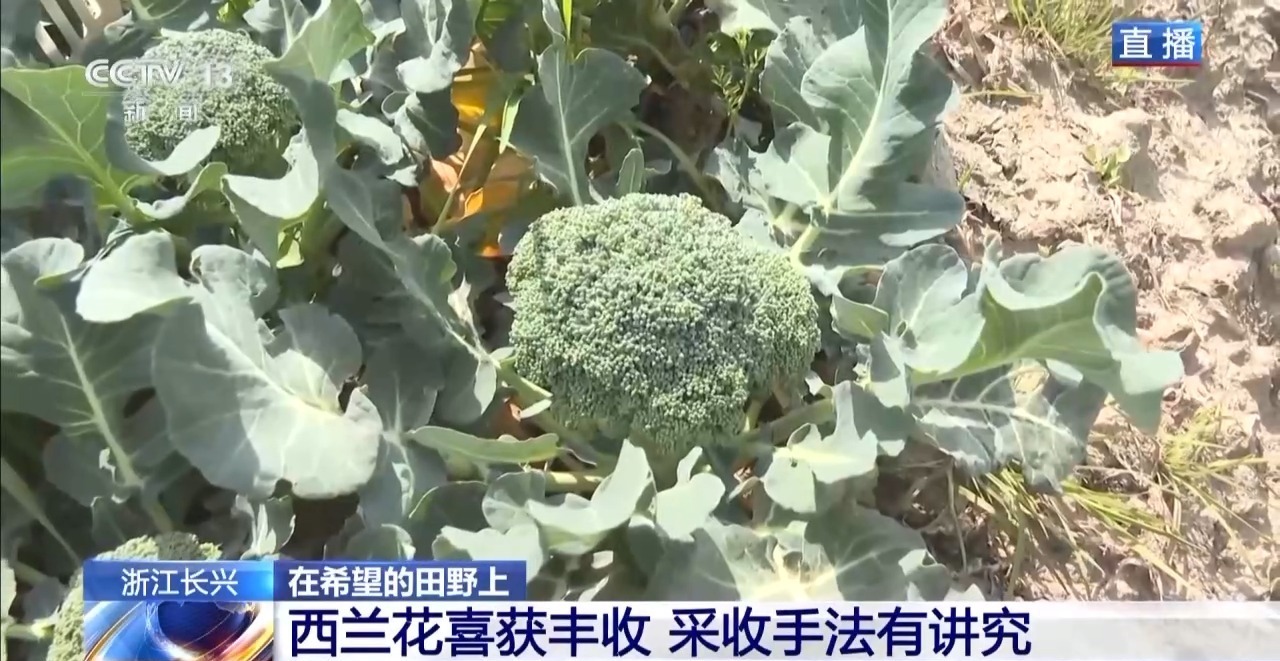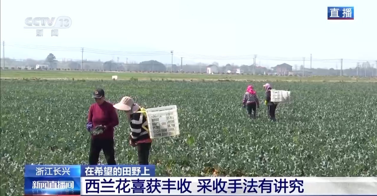总台记者 夏周:在蔬菜种植基地内,这一大片总共有1700亩土地,其中1500亩种植西兰花,早上不到七点就开始了今天的采收。在我的身后,村民们穿梭田间,手起刀落间,一个个半球形的西兰花花球就被剥离出来,装进框里。