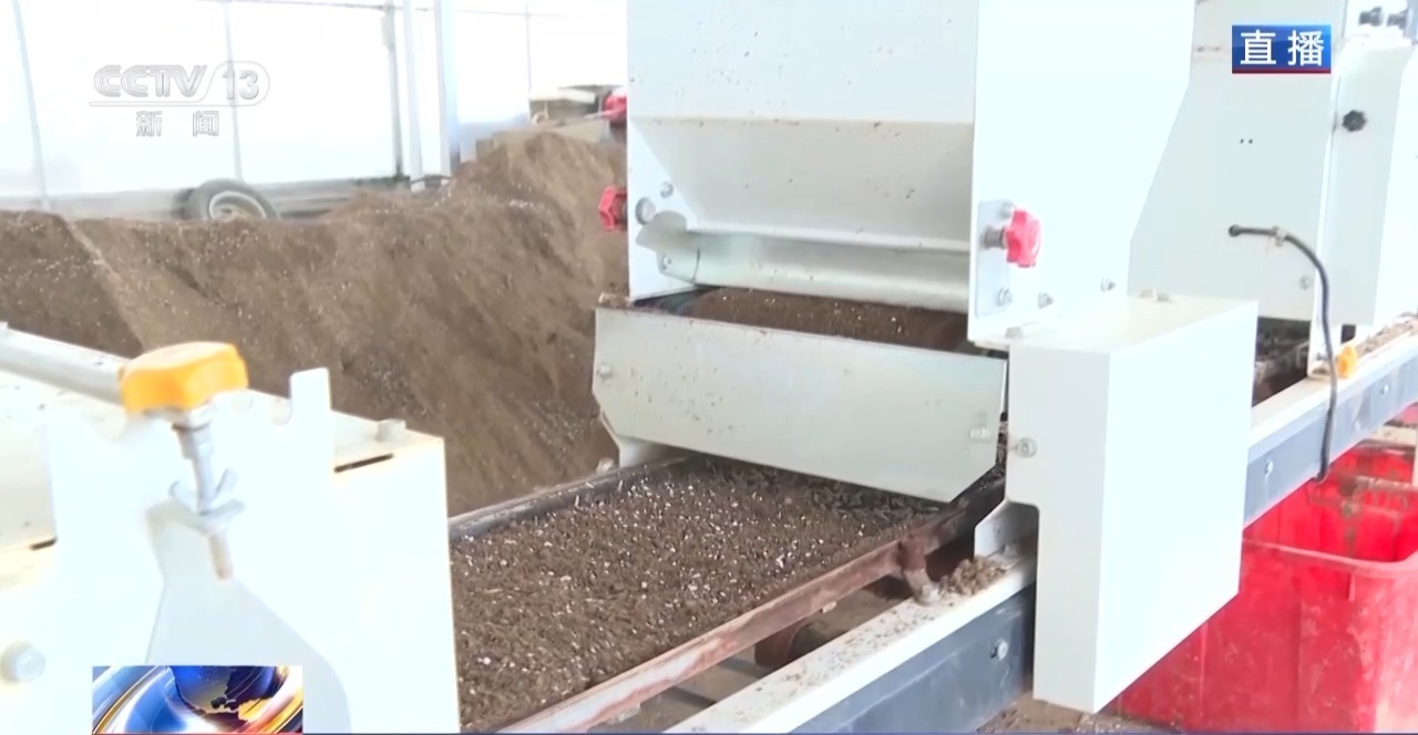 土地整耕好了,还要有好苗子栽种才行。农田边的育秧流水线也在加足马力作业,这就是育秧盘上的育秧土了,摸起来很湿润,它是由晾晒后的泥土打碎,加入了壮苗剂和机制土搅拌而成的,相当于是给早稻的种子提前做好了营养餐。在这条流水线上,垫土、浇水、播种、覆土都能够迅速完成。每隔六秒就能下线一盘早稻的育秧盘。