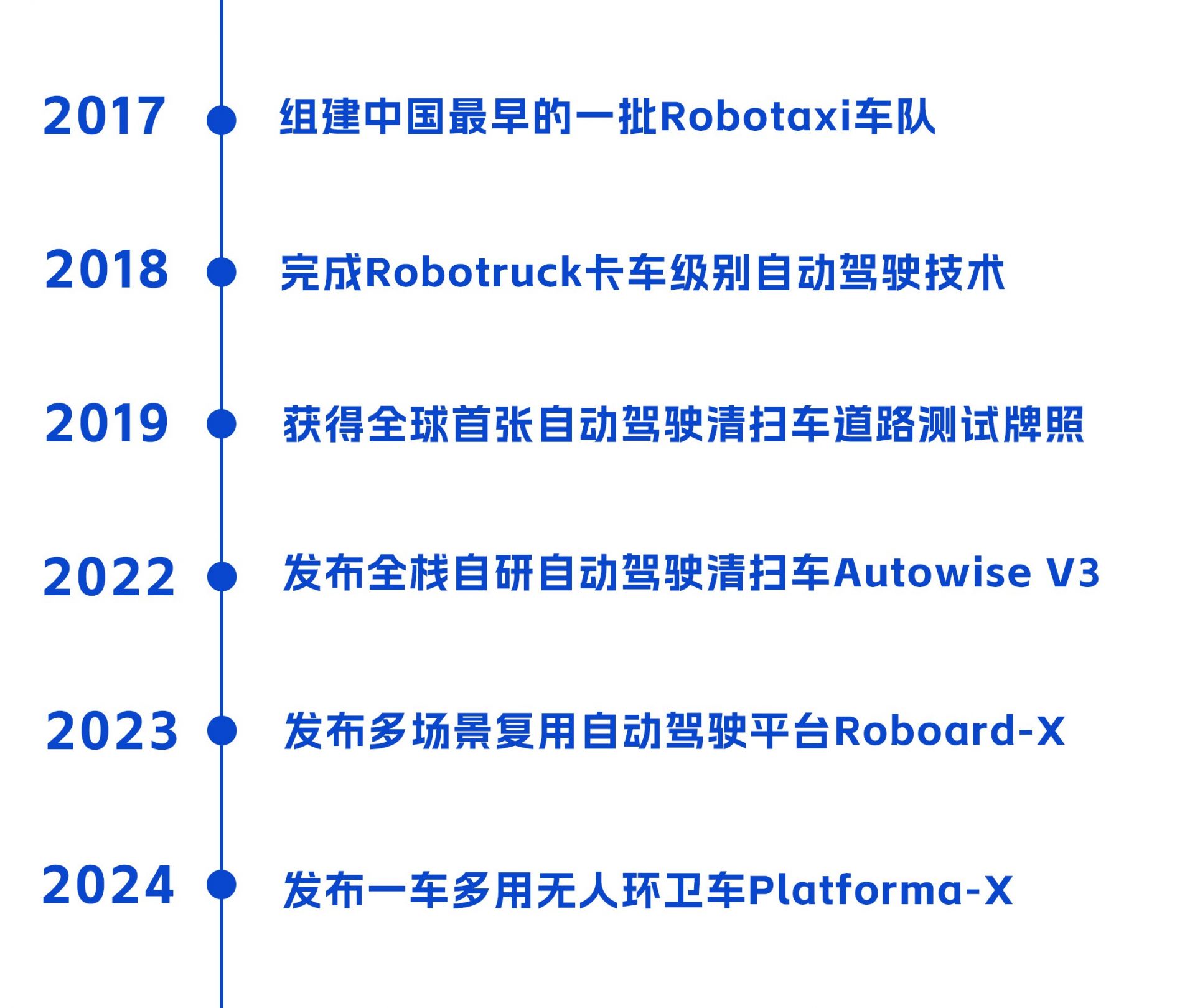 2022年9月,仙途智能发布软硬结合、全栈自研的无人驾驶清扫车Autowise V3,凭借全面领先的无人驾驶能力和清扫能力,已经成为市面上最广泛应用的无人驾驶清扫车。2023年1月,仙途智能推出全新共享自动驾驶底盘Roboard-X,可实现多场景上装的灵活变换,满足客户在同一个场景里对短途接驳、物流运输、清扫等多功能车辆的应用需求,实现了跨场景的高效复用。