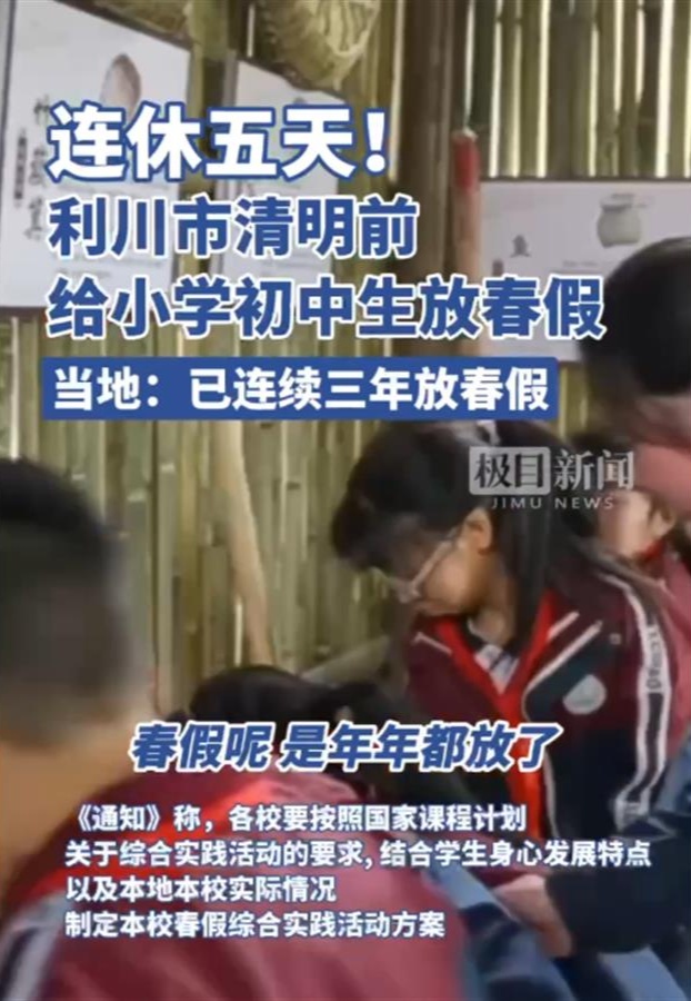 日前,湖北省恩施州利川市教育局发布通知,该市小学、初中4月7日、8日放春假2天,与清明假期相加,可连休五天。