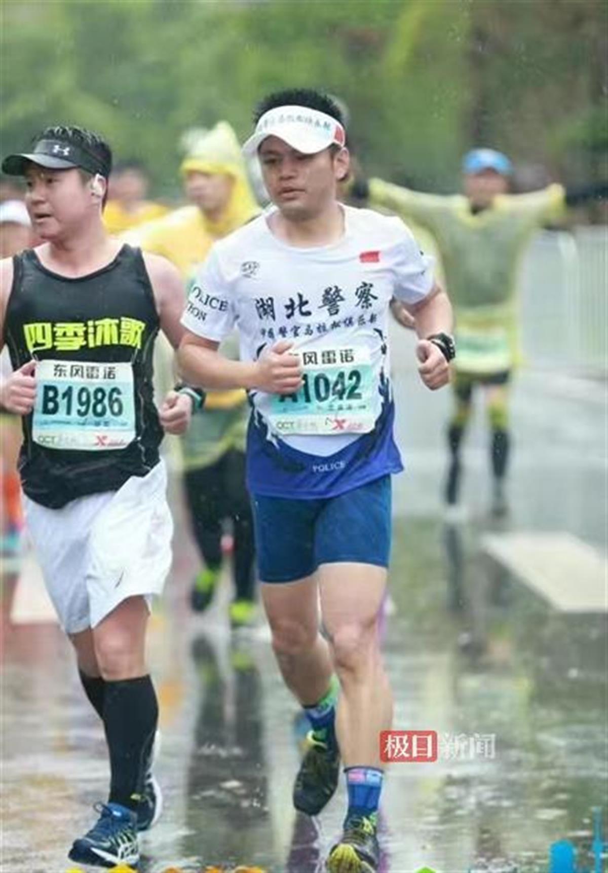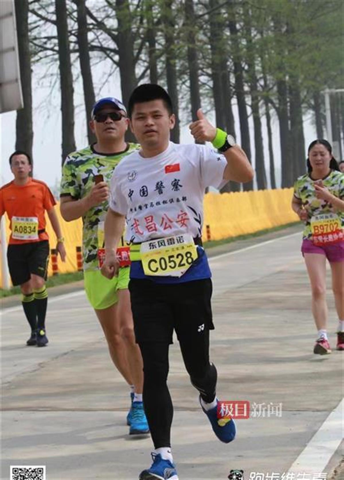 2016年4月,第一届武汉马拉松开赛,王金涛身穿“武昌公安”运动服,第一次踏上全马赛道,既是参赛运动员,也是赛道流动安全官。
