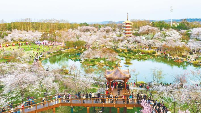 3月21日,武汉东湖樱花园的上万株樱花盛放,形成连片如云似锦的花海,园内游人如织,十分热闹。(湖北日报全媒记者 任勇 摄)
