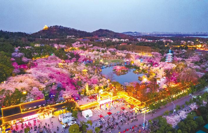 3月21日傍晚,鸟瞰武汉东湖樱花园,园内游客熙熙攘攘,9000多组灯组勾画出古建筑群的灵动轮廓,将赏樱氛围烘托到极致。 从3月初起,东湖樱花园开启日间与夜间全时段赏樱模式。 (湖北日报全媒记者 朱熙勇 摄)