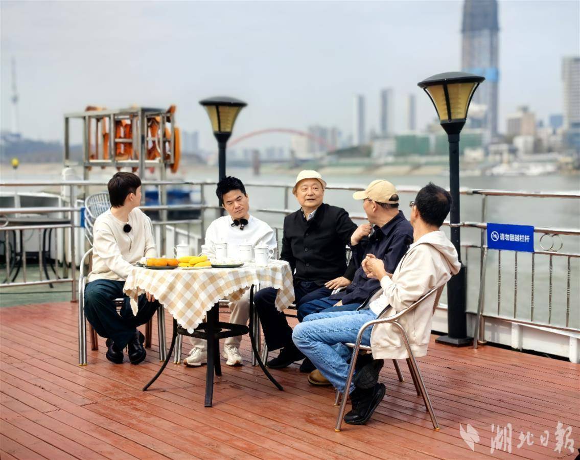 “汉阳门”号游船从汉阳门码头驶出,顺江而下。董宇辉、俞敏洪、董董和特邀嘉宾王汗吾、冯翔惬意地坐在“汉阳门”号游船三楼观光甲板上,沿途欣赏两江四岸美景的同时,畅聊武汉的古今传奇,感叹沿岸的日新月异。武昌岸的“黄鹤楼”雄奇多姿、汉口岸的江汉关钟楼传出悠扬的钟声、两江交汇处的晴川桥、龟山上的电视塔......嘉宾们从游船上望去,长江两岸的美景尽收眼底。