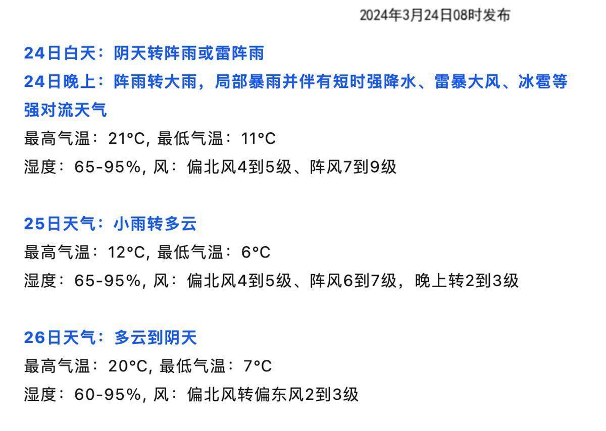 湖北日报讯(记者汤炜玮、通讯员武气象)3月24日从武汉市气象局获悉,今晚武汉市降水强度加大,并伴有短时强降水、雷暴大风、冰雹等强对流天气。下周前期,武汉市仍有弱降水发生,到了中后期,晴暖天气再度回归,有利于大家洗衣晒被和外出赏花游玩。