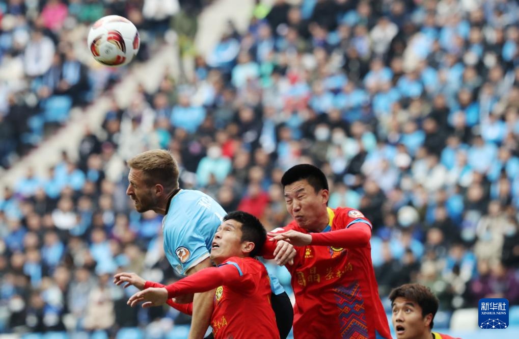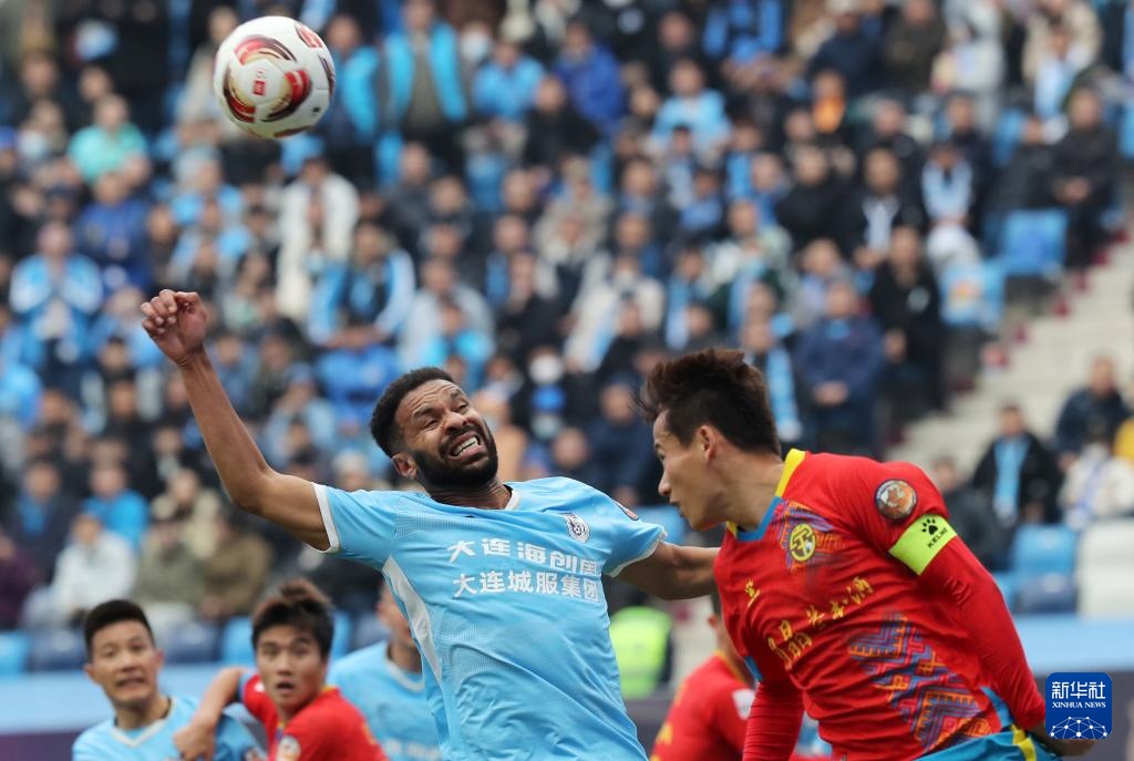 3月24日,大连英博队球员科特尼克(左一)在比赛中争顶。新华社记者 李钢 摄