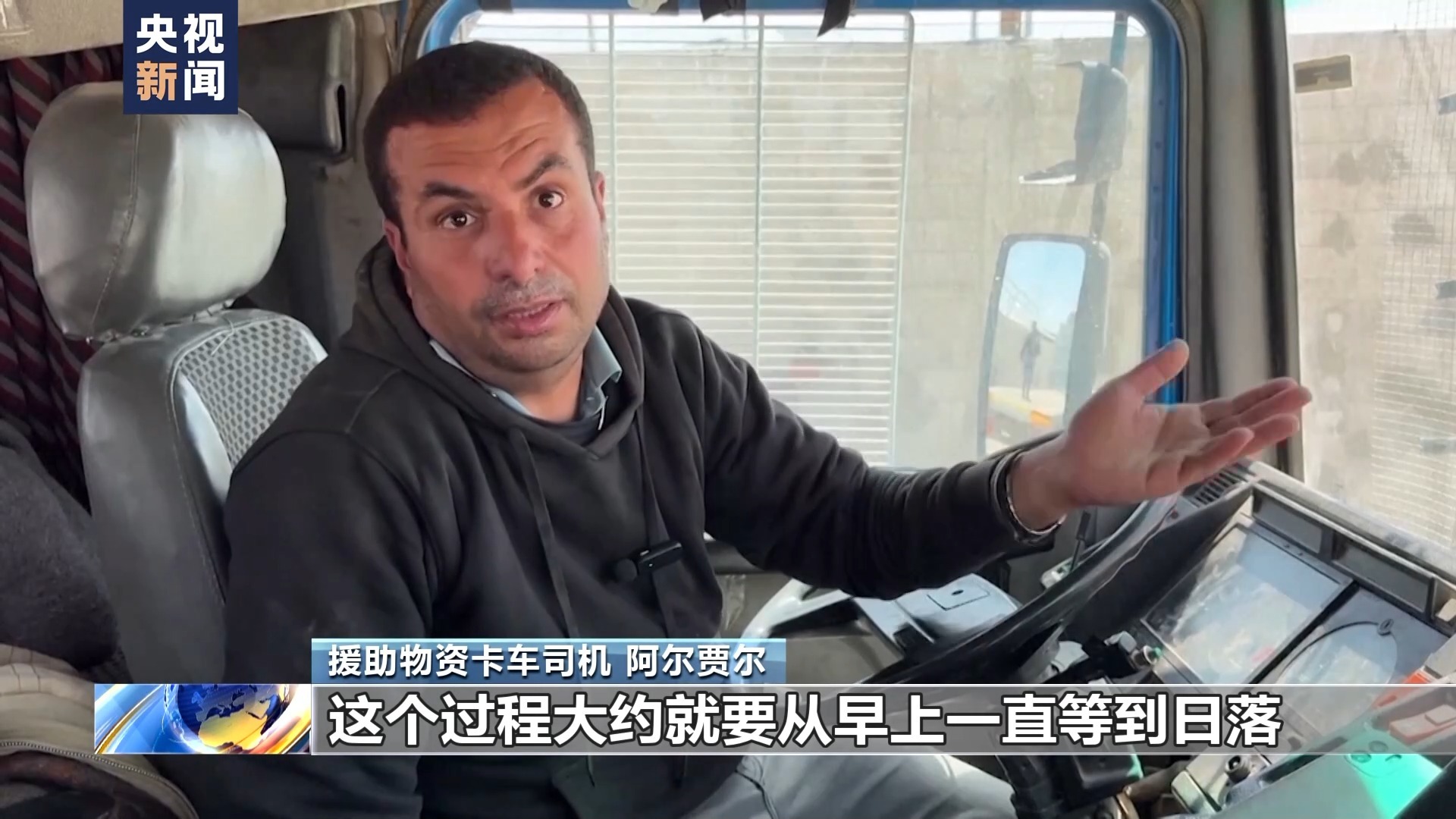 在从以色列和从埃及进入加沙地带的两处过境点附近,运送援助物资的卡车排起长队,等待通关。卡车司机阿尔贾尔说,一辆运送援助物资的卡车从装货、到证件审批,再到安全审查,手续十分繁琐,每一道程序都需要漫长等待。