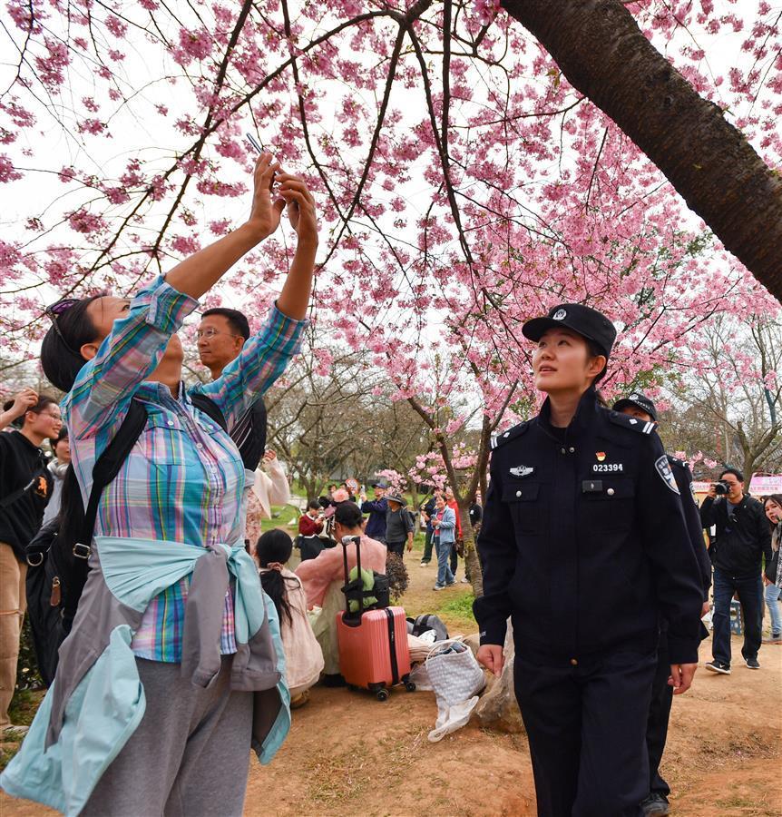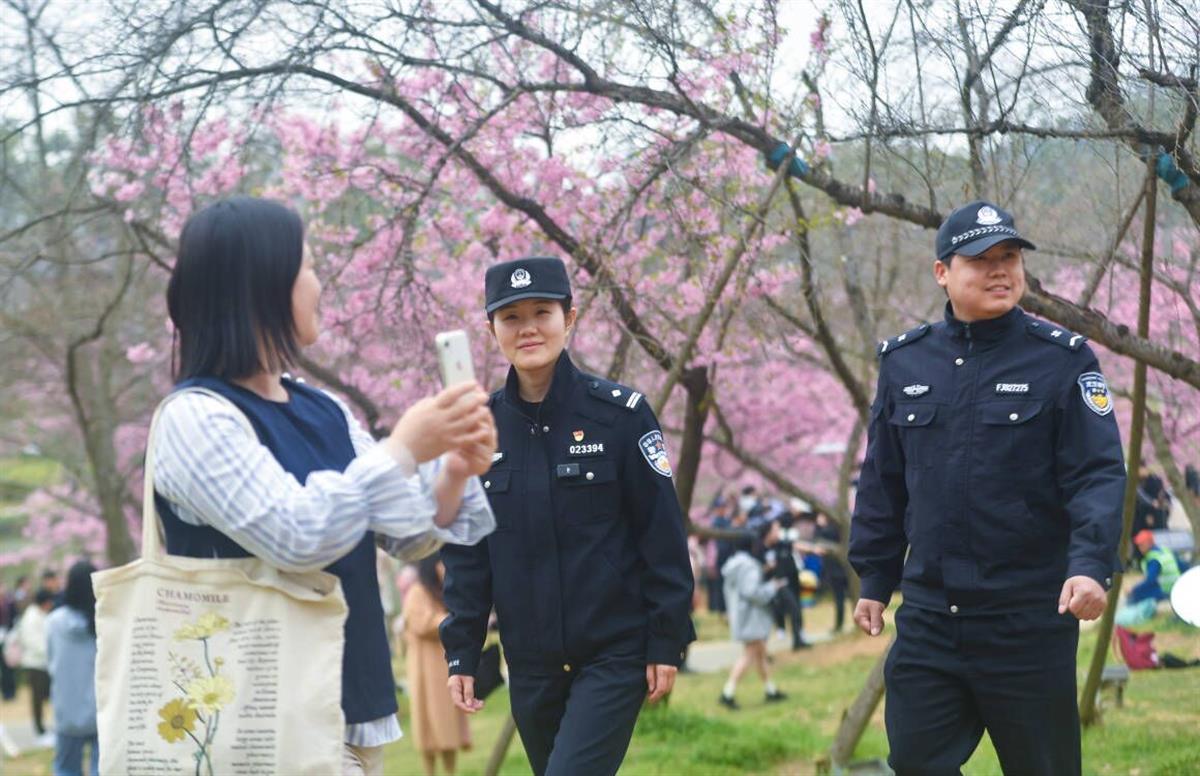 针对今年上新的赏樱“空中栈道”,公安机关安排了充足警力,协助磨山管理处工作人员维持通行秩序,确保安全。