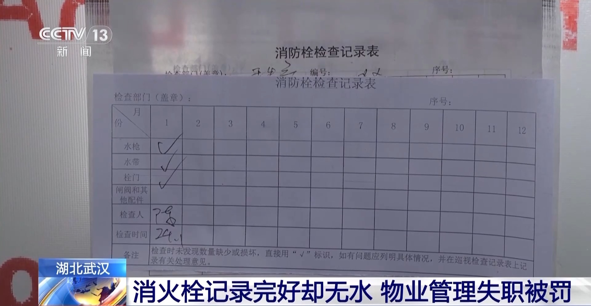 在一处消火栓上的检查表里,消防员看到,上面记录着小区物业公司最近一次检查时间是在2024年1月,并标注水枪、水带、栓门等消防设施完好,并未发现缺少或损坏。不过检查表里却未记录消防栓无法出水的问题。