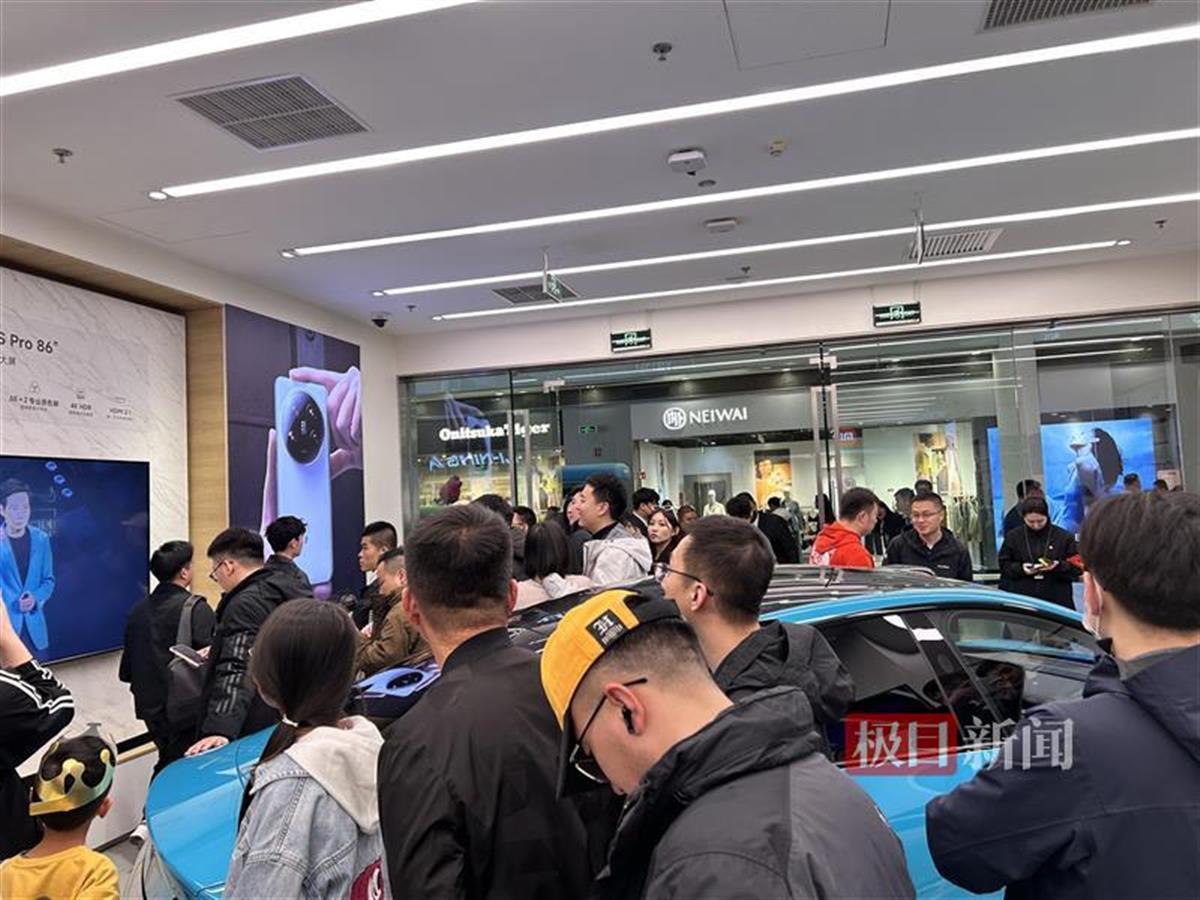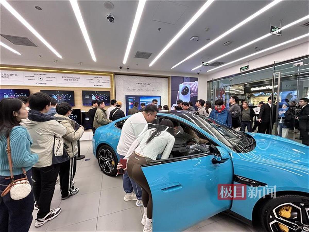 当晚,极目新闻记者来到北京市大兴区“小米之家”北京荟聚汽车体验店,店内多台电视同步直播小米发布会,数十名消费者进店围观新车,有年轻人聚在一边讨论小米SU7的外形、颜色,还有人轻拍车引擎盖和车门,仔细检查车胎等。