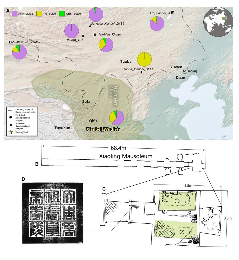 此外,研究团队通过对武帝基因组进行分析,从遗传学角度揭示了鲜卑族武帝及其家族的族源。团队发现,北周武帝血统大部分源于古代黑龙江流域的东北亚人群,少部分来源于古代黄河流域的农业人群。