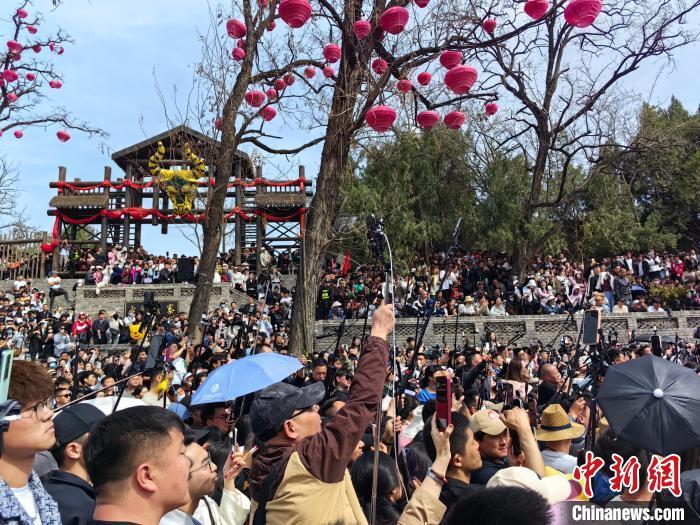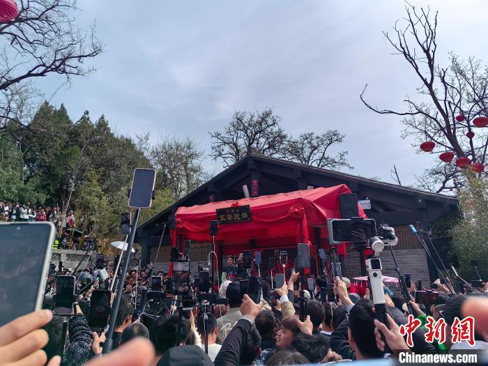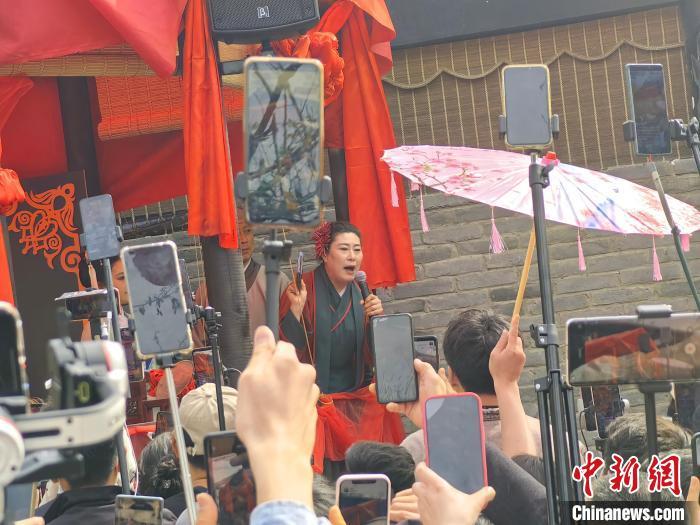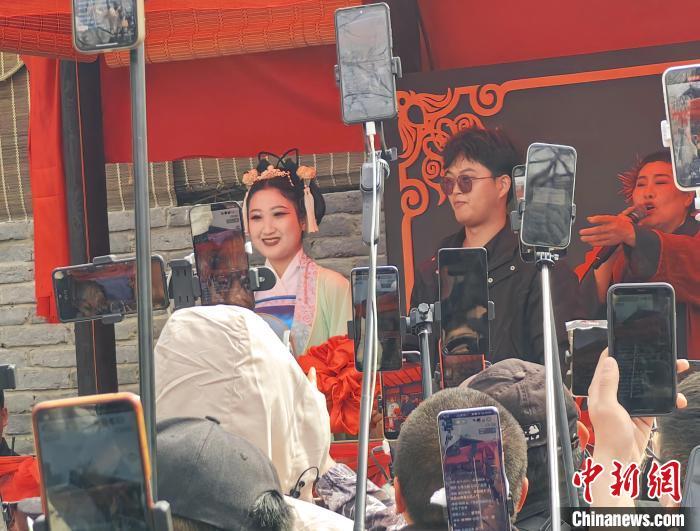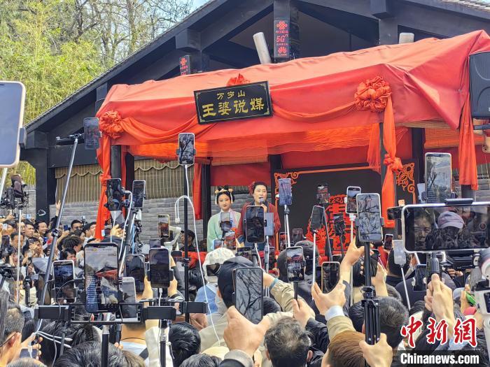 近日,河南开封万岁山武侠城景区内的一档相亲节目“王婆说媒”走红网络,吸引大量游客前往古城开封,“王婆”的饰演者赵梅也因为上佳口才和控场功力受到关注。3月30日,中新网记者走访万岁山武侠城景区看到,“王婆说媒”现场人潮涌动,忙碌的“王婆”为台上台下的单身男女牵线说媒,气氛活跃,让游客沉浸式体验了开封的大宋市井文化。
