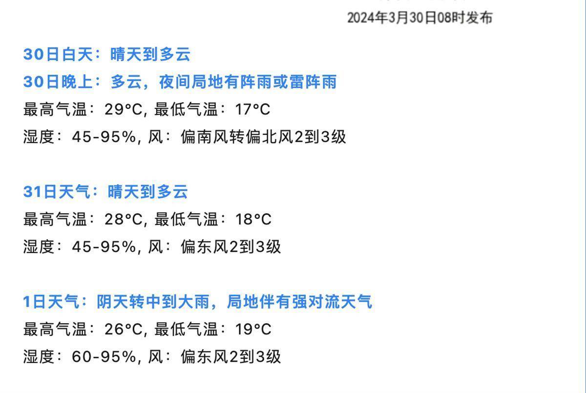 湖北日报讯(记者汤炜玮、通讯员武气象)3月30日从武汉市气象局获悉,今明两天武汉市晴好天气持续,最高气温都在28℃左右,适合外出游玩踏青,但需要注意,今日夜间局地有阵雨或雷阵雨,4月1日至2日还有一波强对流天气。武汉市气象局提醒市民,要及时关注短期临近天气预报。