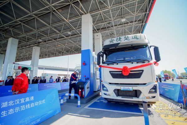 3月30日上午,随着第一辆氢能源货车在沪渝高速潜江服务区加氢完毕,标志着湖北首条氢能源生态示范线正式投入运营。