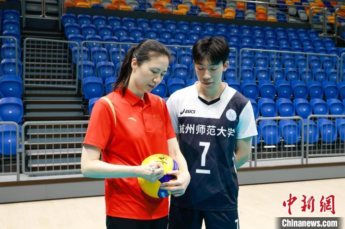 当日,共青团浙江省委书记、前中国女排国家队队员、雅典奥运会冠军周苏红为杭州师范大学“浙青年·爱运动”体育文化节排球联赛开球。(完)