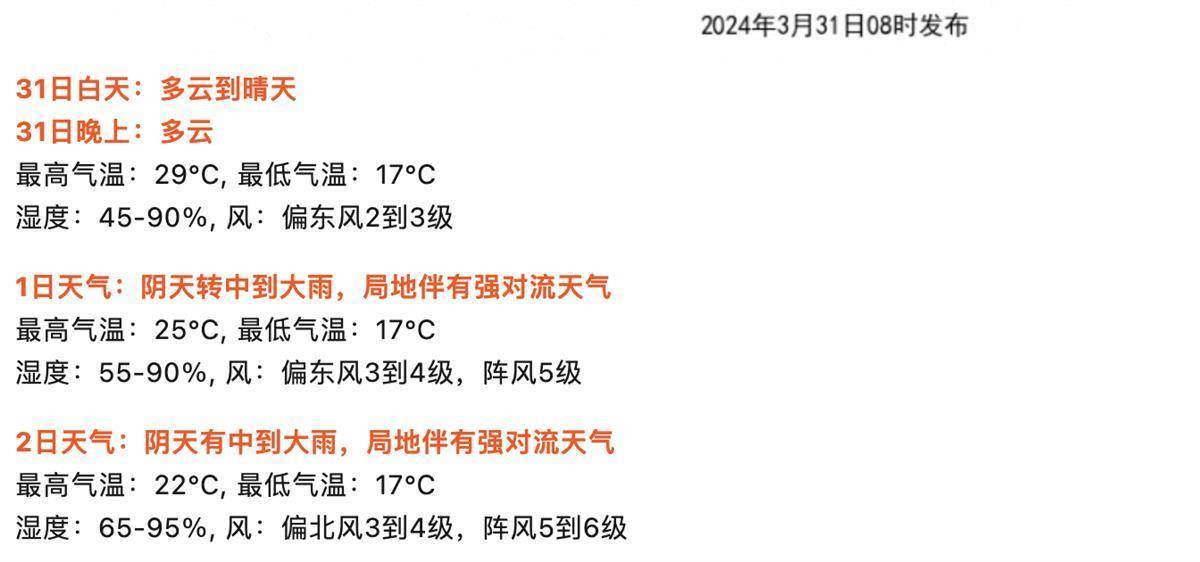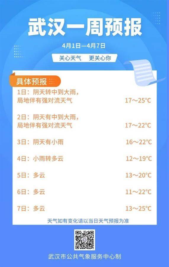 昨天白天武汉市晴天到多云,夜间阴天转雷阵雨,北部小到中雨,南部中到大雨。预计4月1日至2日受高空槽和中低层切变影响,武汉市有较明显降水发生,伴有强对流天气;3日至4日还有弱降水。此外4月2日至4日冷空气南下,武汉市北风增强,气温下降。