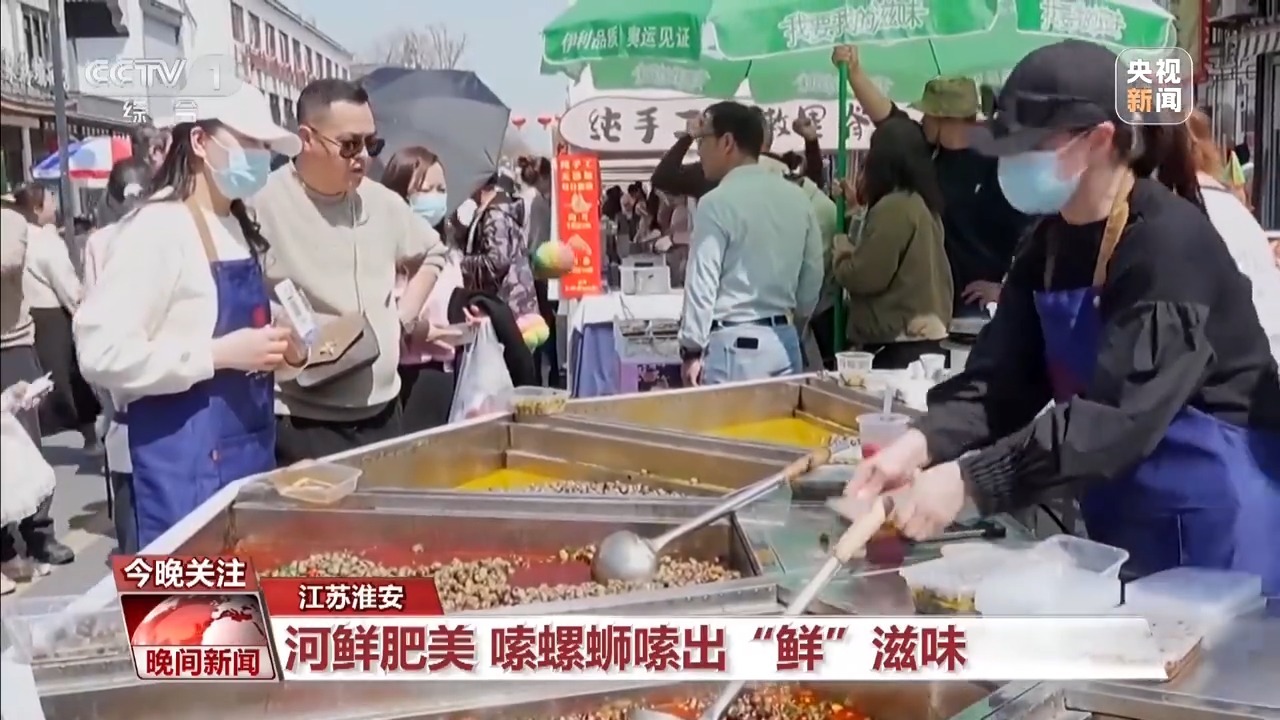 清明螺,赛老鹅。位于洪泽湖畔的江苏省淮安市洪泽区蒋坝镇,螺蛳市集火热开张,吸引数万人前来嗦螺蛳。 晌午时分,商家们将新鲜烧制的蒜泥、十三香等各色口味的螺蛳摆放出来,满足来自四面八方游客的味蕾。