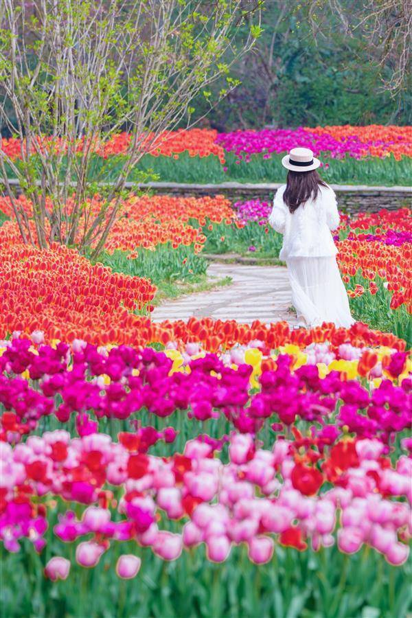 在武汉植物园,60万株郁金香正合力营造着色彩缤纷、繁花烂漫的春日花园。中花和晚花品种已经开放,除了常见的杯型郁金香,还可以欣赏到流苏花型、牡丹花型、百合花型的郁金香。花海花林颜值达到巅峰,芳草优美、落英缤纷,绽放出春日的无限魅力。