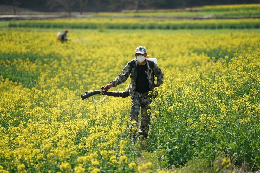 3月22日,村民在陕西安康旬阳市双河镇的一处油菜花田中进行春防作业。新华社记者 邵瑞 摄