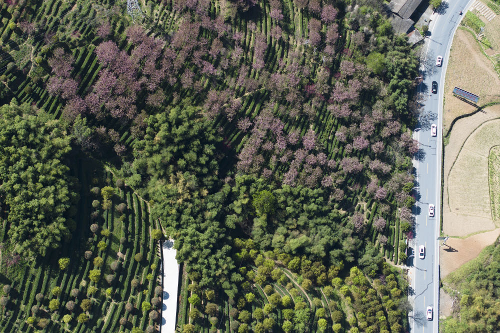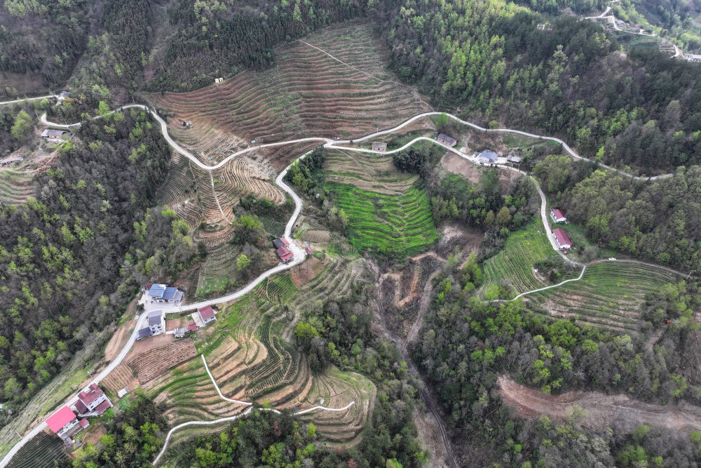 陕西安康市平利县长安镇洪福茶山景色(3月31日摄,无人机照片)。新华社记者 邵瑞 摄