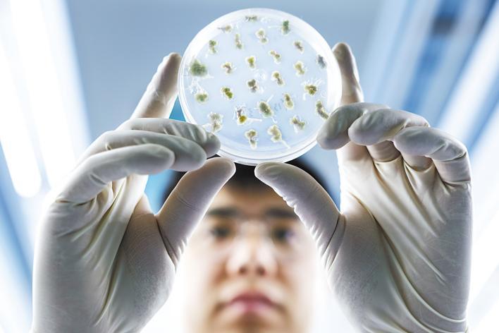 3月19日,油料分子改良方向科研助理张亮在组培生长间内观察油菜愈伤组织生长情况。
