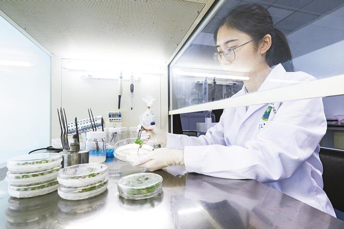 3月19日,在中国农科院油料所实验室内,油料作物分子改良方向科研助理刘婧琳在无菌操作台上进行油菜遗传转化操作。