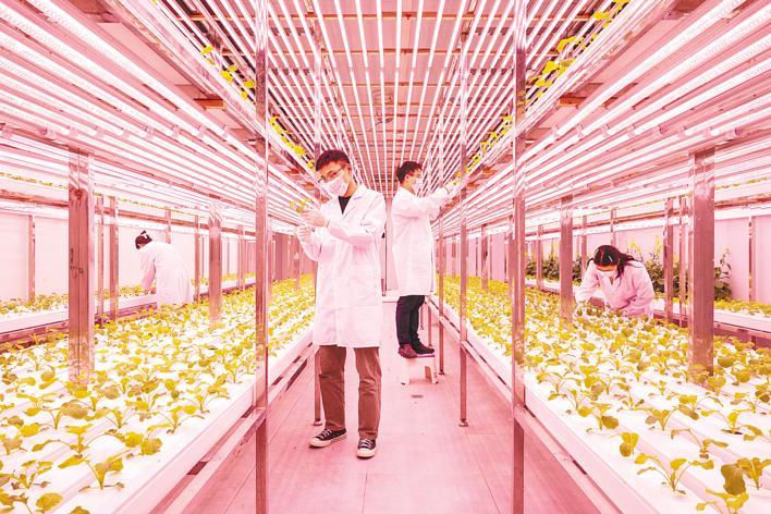 3月18日,在中国农科院油料所植物工厂内,科研助理匡列琼(右一)和同事田泽(右二)、胡小晗(左一)、余坦(左二)正在定期维护油菜植株,并观察记录。
