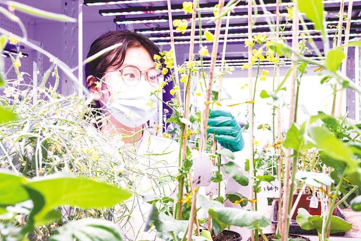 3月18日,在中国农科院油料所的智能人工气候室内,油菜抗逆方向研究生李一林正在对油菜植株进行杂交操作。