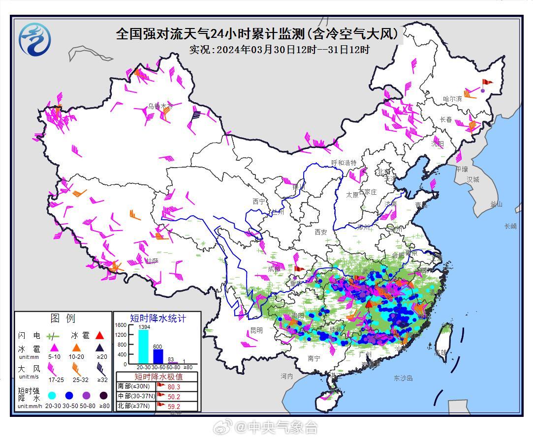 中央气象台4月2日发布:3月31日,江西南昌出现极端强对流天气,监测到闪电2783次,58个站(超过全市观测站一半)出现8级以上大风,13个气象观测站风力突破历史纪录,最大风速出现在南昌县塘南红星(35.3米/秒,12级),雷暴大风影响范围广,历史罕见。需要注意的是,4月2日至4日,江西、浙江、福建等地仍多风雹,并具有一定极端性。