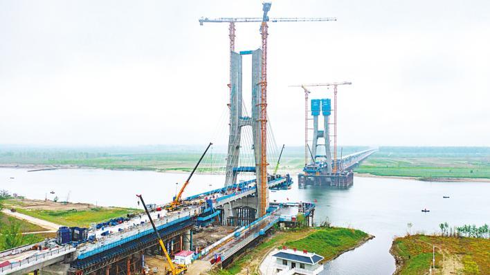 4月2日,沪渝蓉高铁钟祥汉江特大桥建设现场。4月1日夜间,随着最后一方混凝土浇筑完成,由中铁十一局承建的沪渝蓉高铁武宜段钟祥汉江特大桥主桥西岸边跨率先实现合龙,标志着这座世界最大主跨的高速铁路无砟轨道混凝土梁斜拉桥实现首个边跨合龙。(视界网 古建敖 摄)