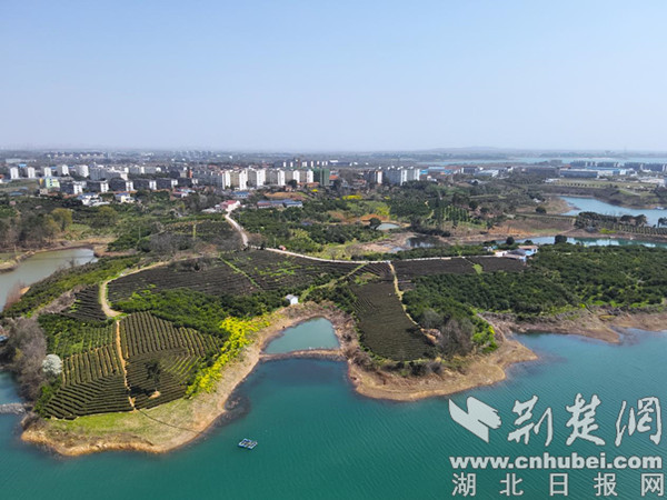 风光秀丽,生态宜人,美丽的漳河,不仅有着东方夏威夷、中国爱琴海的美誉,更是荆门人民的母亲河,滋养沿岸百姓的同时,也繁荣了荆门的工、农业发展。,“这是我们合作社最大的一片茶园,大概有两百亩。这几年我们通过发展,合作社的社员也由7户发展到100户,因为我们漳河库区独特的小气候、还有我们漳河优质的水源,我们种出的茶叶品质也非常好,我们最好的茶叶在市场上可以卖到一千多块钱一斤,我们茶叶优质率也是达到了80%以上。”荆门市绿玉茶叶专业合作社理事长蔡高凡介绍。“我们迎接村主要是以种柑橘为主,柑橘品质提高起来以后,市场的价格要往上回升,总收入,像我的这个园子,一千多棵树,每年柑橘的收入,要占家庭收入的百分之七、八十以上。”漳河新区漳河镇迎接村果农张宏说到。