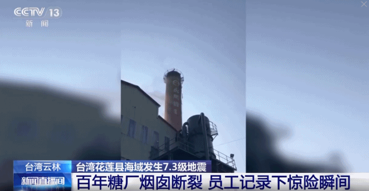 今天早上7时58分,台湾花莲县发生7.3级地震后,各地余震不断,在云林虎尾的百年糖厂有一个老烟囱在一阵剧烈摇晃后折断,现场工作人员记录下了惊险瞬间。