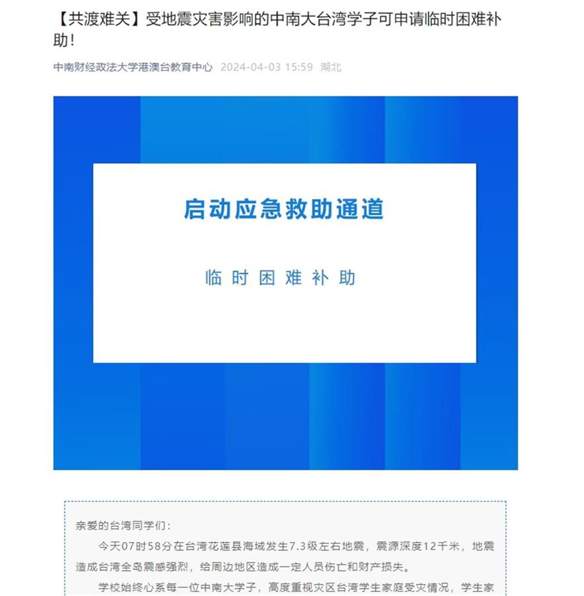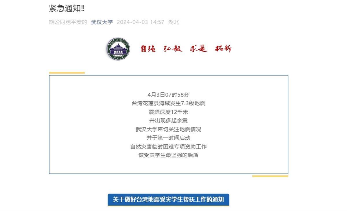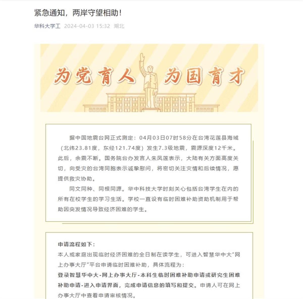 4月3日,华中科技大学发布紧急通知,台湾地震受灾学生可申请临时困难补助。