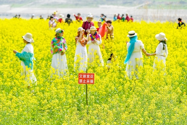 武汉市硚口区汉江湾体育公园内的油菜花海吸引了众多市民打卡