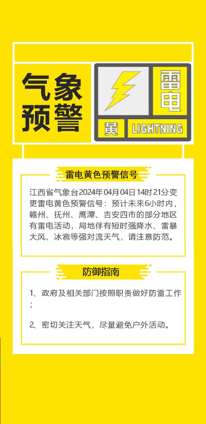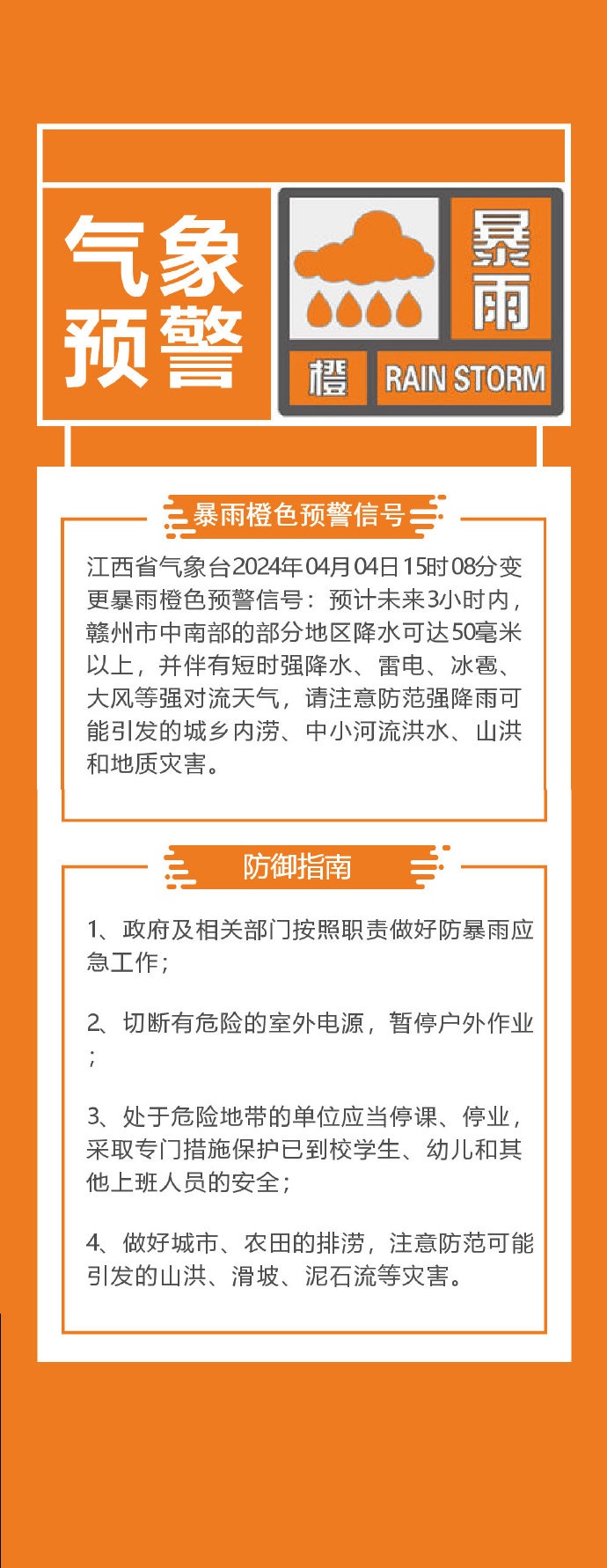 江西省气象台2024年04月04日14时21分变更雷电黄色预警信号:预计未来6小时内,江西赣州、抚州、鹰潭、吉安四市的部分地区有雷电活动,局地伴有短时强降水、雷暴大风、冰雹等强对流天气。同时15时08分变更暴雨橙色预警信号:预计未来3小时内,江西赣州市中南部的部分地区降水可达50毫米以上,并伴有短时强降水、雷电、冰雹、大风等强对流天气,提醒注意防范强降雨可能引发的城乡内涝、中小河流洪水、山洪和地质灾害。