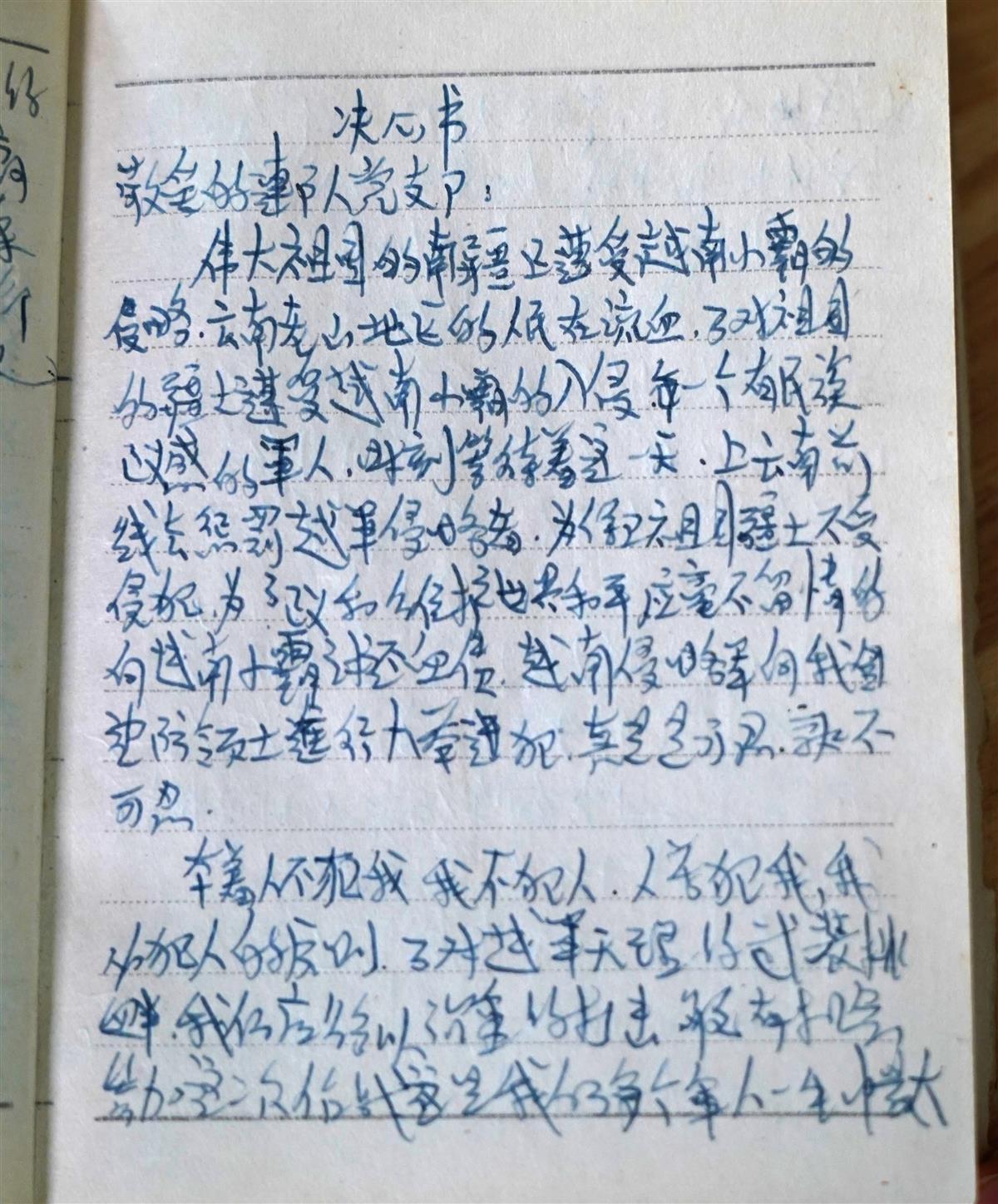 “我敬请连队党支部批准,在这场战斗中,请把最艰巨的任务交给我,我一定不辜负连队党支部的期望,圆满完成战斗任务。请连队党支部在战场上考验我吧!”这是刘文平日记本中《决心书》的一段话,落款日期是1985年2月6日。