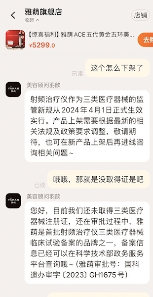 4月1日,市民张小姐发现,此前添加至购物车的一款标价5299元的雅萌ACE五代黄金五环美容仪产品已经下架。询问品牌客服才得知,是因为4月1日正式施行的监管新规,产品上架需要根据最新的法规及政策要求进行调整。